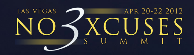 The No Excuses Summit is being held between April 20th and April 22nd 2012 in Las Vegas. The event is "an annual mega live event bringing together network marketing's and internet marketing's 'all star' top producers, in a safe and intimate 'no pitch' format for entrepreneurs to learn from, interact and network directly with speakers and industry top earners in attendance."